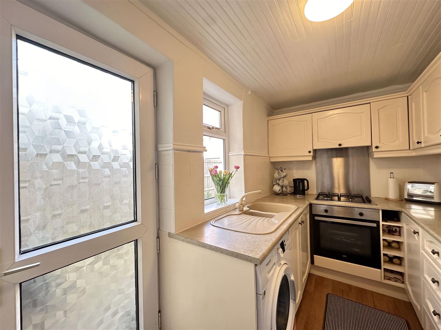Matching high and low level storage units with laminate roll edged work surfaces and complimentary tiled splashbacks. Inset one and a half sink and draining board. Integrated four ring gas hob with oven and grill beneath with extractor fan and stainless steel splashback. Space for full size fridge freezer, vinyl wood effect flooring and UPVC double glazed window to side aspect. UPVC door with double glazed opaque window panels leading to rear garden. Space and plumbing for washing machine.