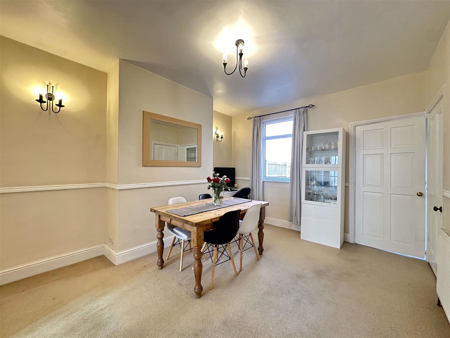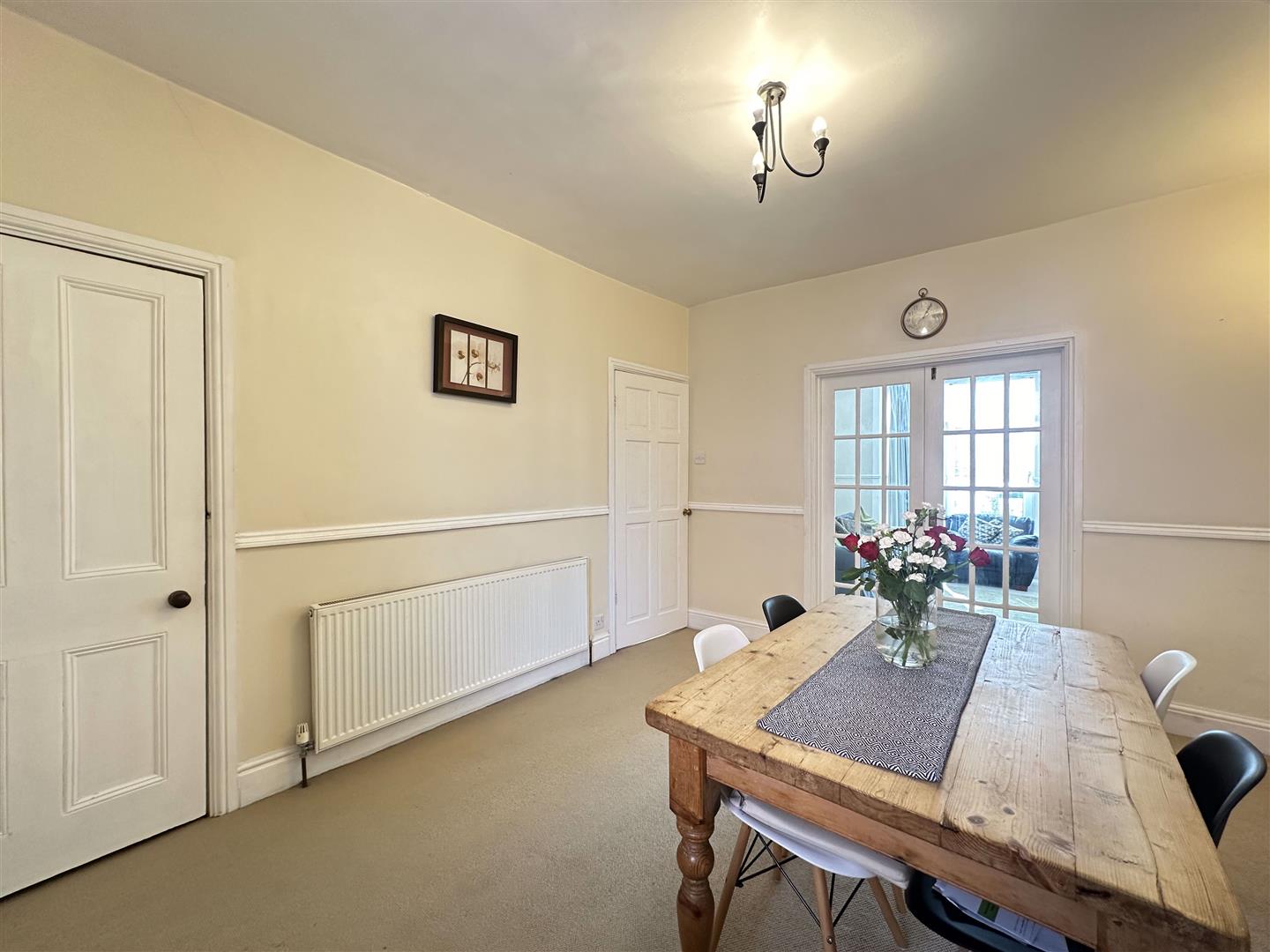 Gas central heated radiator, UPVC double glazed window to rear aspect and picture railing to wall. Double doors leading through to lounge and door leading through to kitchen. Useful understairs storage cupboard.