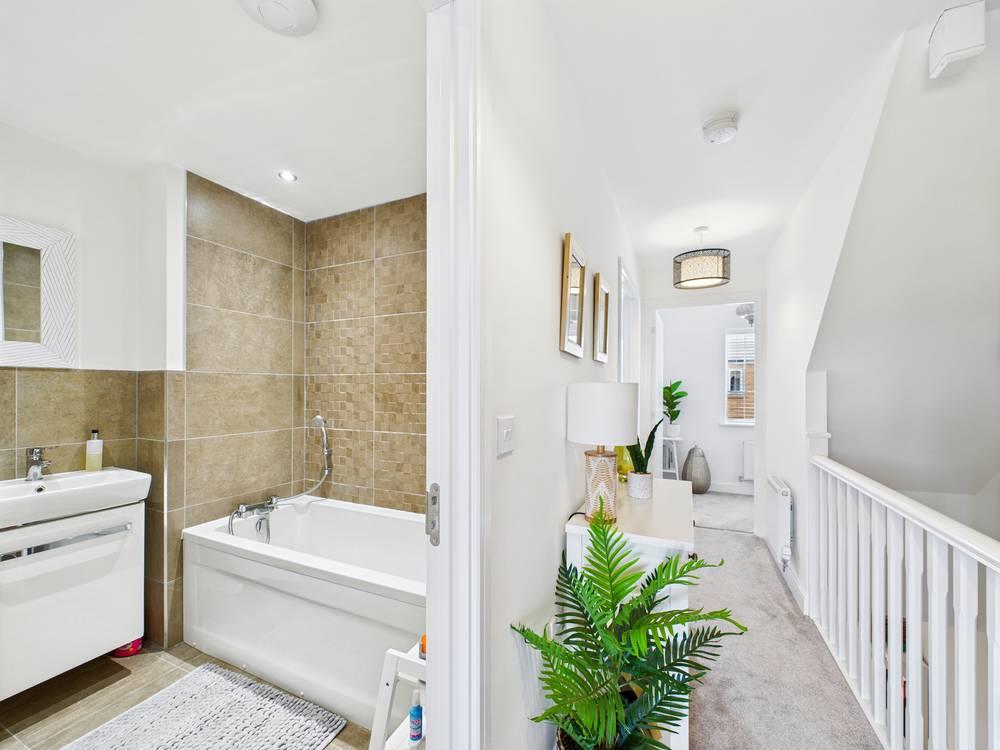 Bathroom Mostly tiled from floor to ceiling with tiled flooring to match, the bathroom has a three piece fitted suite which comprises: close coupled W.C, a vanity style wash hand basin having a chrome mixer tap and a white panelled bath tub with chrome mixer tap and lift away shower head. Chrome towel radiator and inset spotlighting.