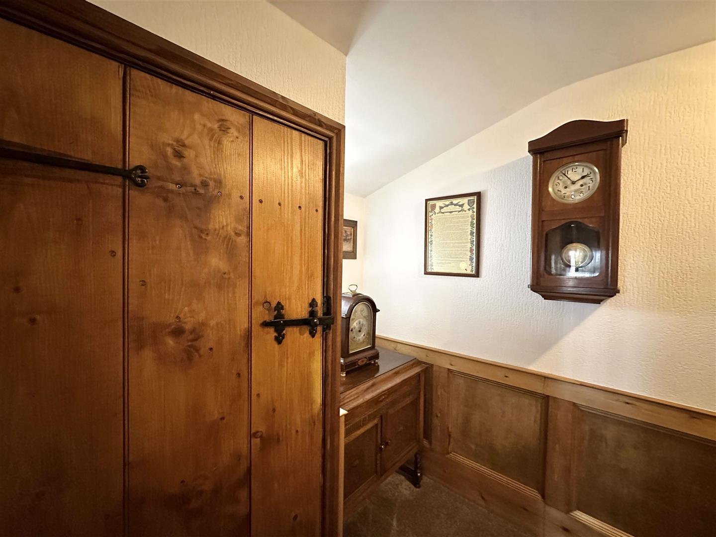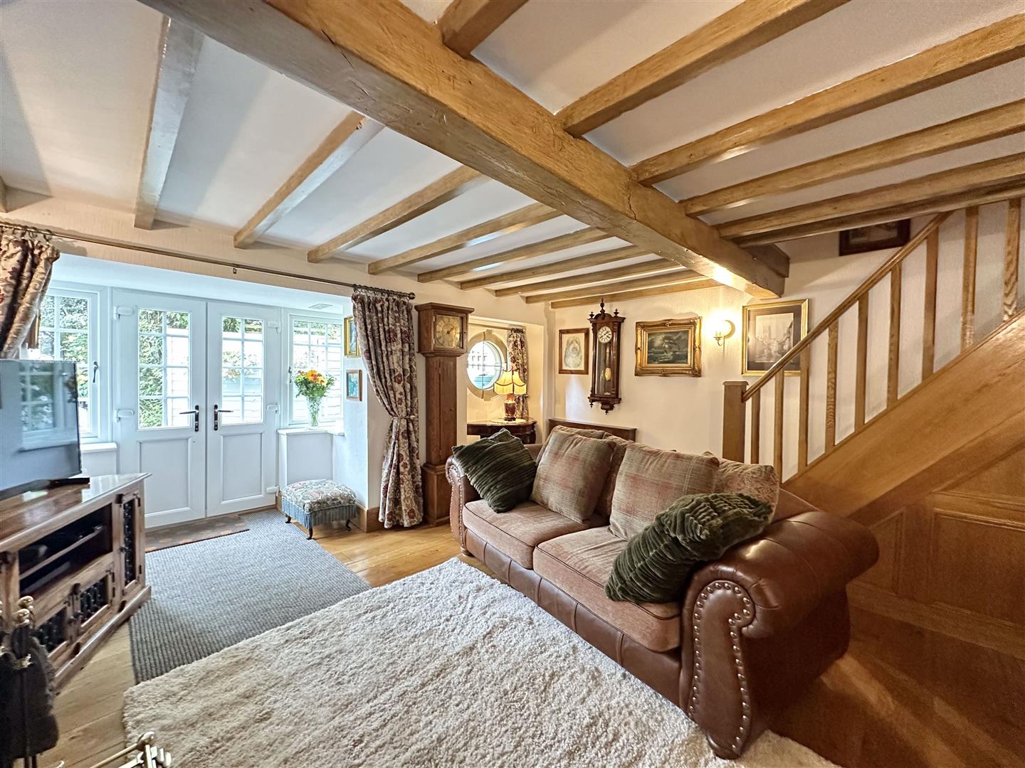 The living room is a warm and welcoming retreat, brimming with character and period charm. Exposed oak ceiling beams draw the eye upward, enhancing the cosy proportions and timeless appeal of the space. At its heart sits a feature fireplace with a stone surround and inset wood burner, perfect for relaxing by the fire on cooler evenings, with a neat log store tucked beside it for convenience. The room is beautifully lit by a combination of natural light from the distinctive round window and UPVC double glazed French doors, as well as soft wall sconces that create a gentle evening glow. Useful Storage cupboard. Tasteful decor, including elegant wall coverings, solid oak internal doors, and classic furnishings, further complement the rustic elegance. Oak stairs leading to the first floor landing