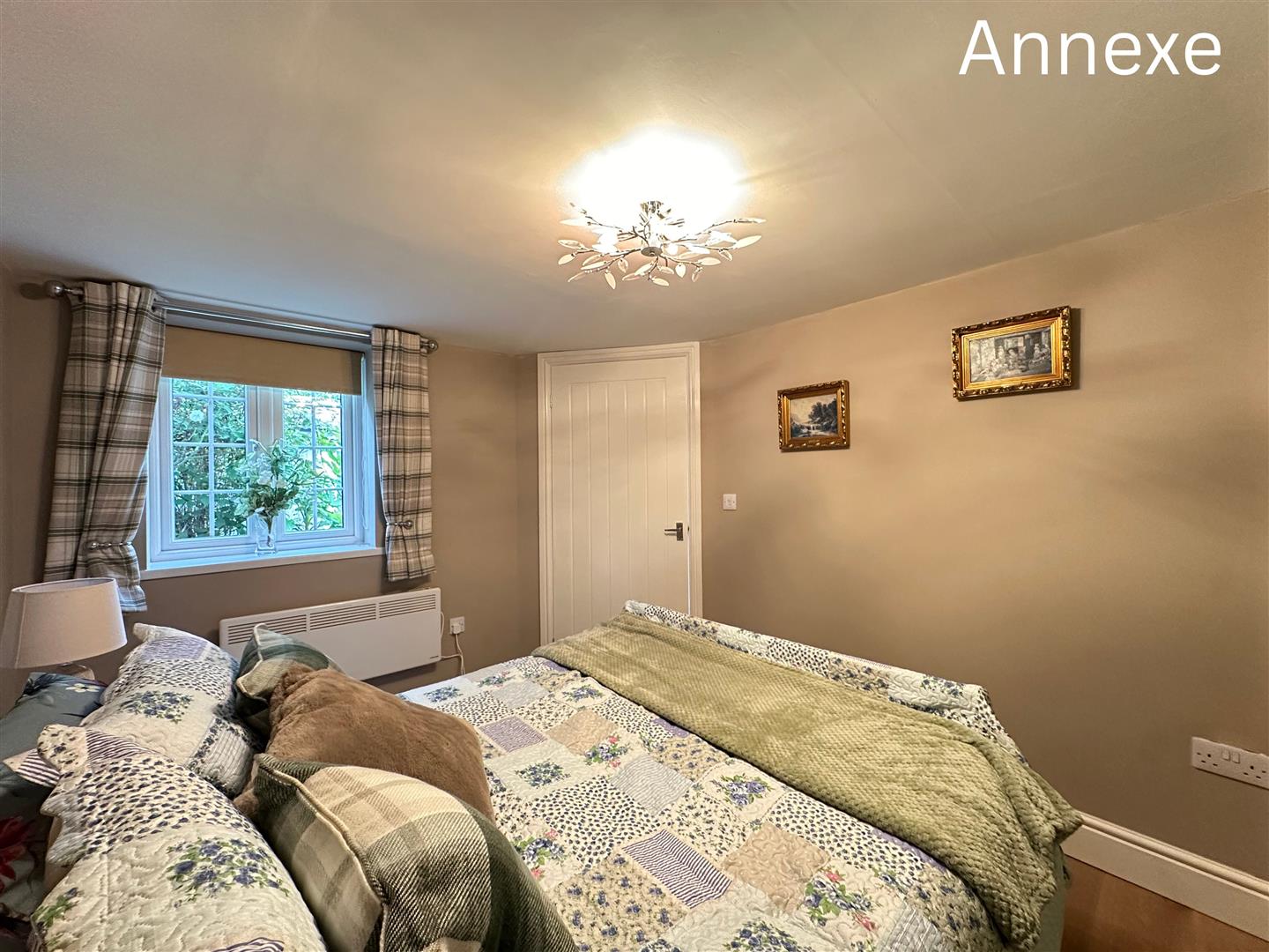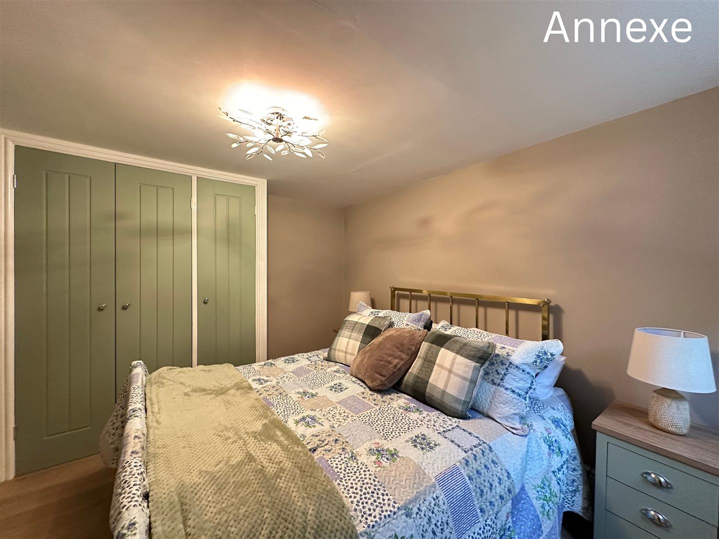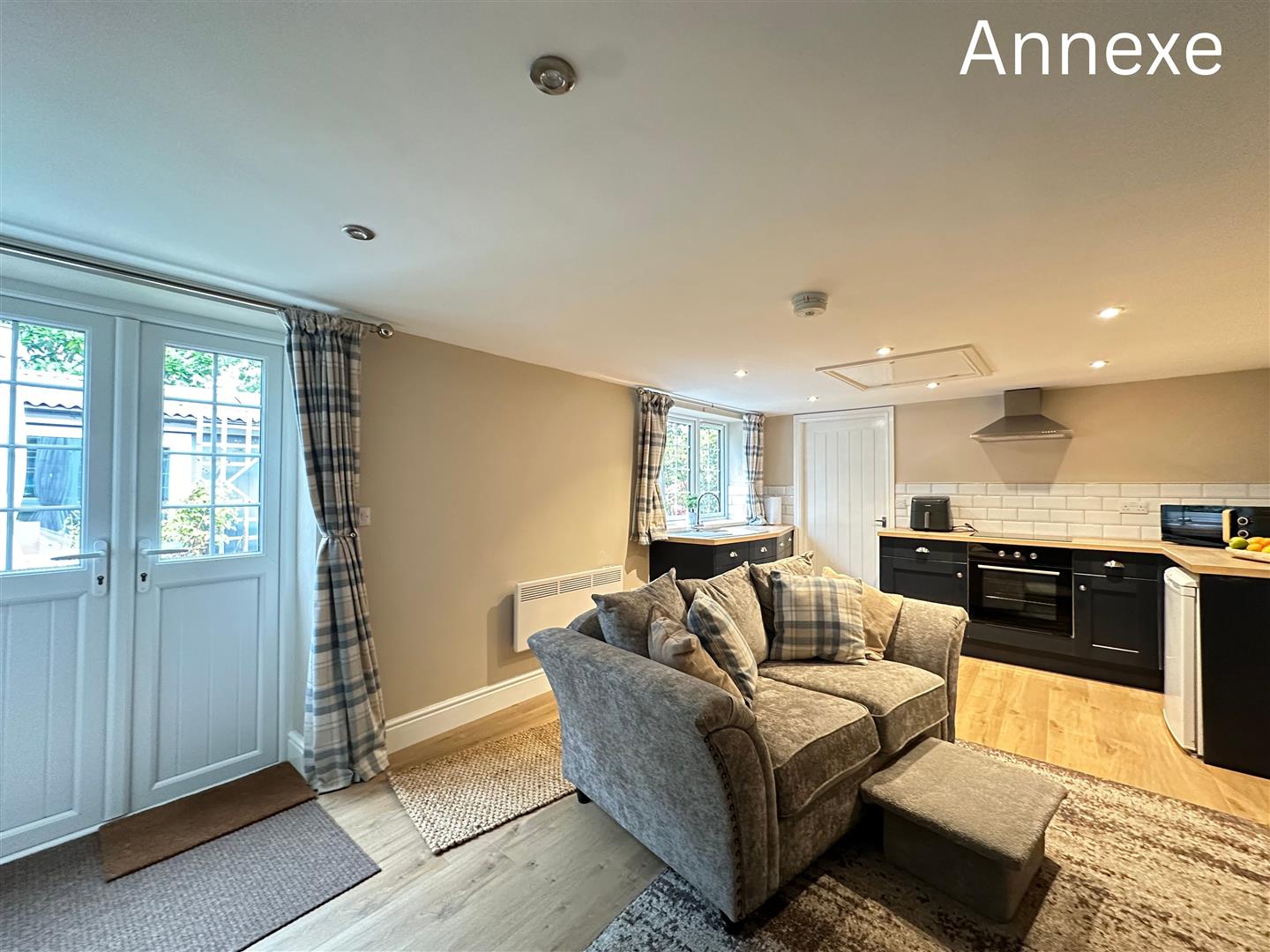 The self contained annexe offers a stylish and practical living space, perfect for extended family and guests. The open plan lounge and kitchen area is bright and inviting, featuring modern units in a deep navy finish, wood effect worktops, and a white tiled splashback. There’s ample room for both cooking and relaxing, with natural light streaming in through dual aspect windows and French doors leading outside. The double bedroom is decorated in calming neutral tones, complete with built in wardrobes and space for additional furnishings. A contemporary shower room adds a touch of luxury, with striking teal subway tiles, patterned floor tiles, and a glass enclosed shower. Finished to a high standard throughout, the annexe provides comfortable, independent living without compromising on style.