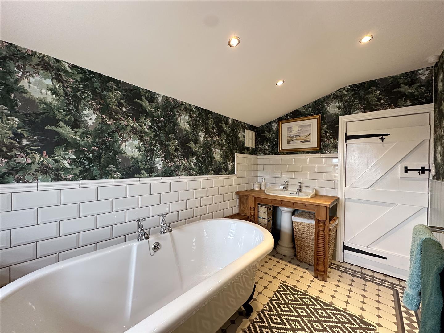 The bathroom is a stylish blend of period elegance and contemporary flair, designed as a true sanctuary within the home. At its heart sits a freestanding roll top bath with ornate claw feet, perfectly positioned beneath a sash window dressed in sheer curtains to allow soft, natural light to filter in. Decorative wall panelling and a striking botanical wallpaper create a rich, inviting backdrop, while crisp white subway tiles add a fresh contrast. The wooden vanity unit, complete with a handwash basin and traditional style taps, adds warmth and character. Vintage inspired touches such as the patterned tiled floor, chrome heated towel rail, and cottage style latch door complete the space, making it both practical and indulgent, ideal for a long, relaxing soak after a busy day.