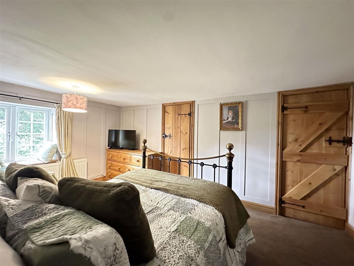 The master bedroom is a serene and inviting space, thoughtfully designed to combine comfort with period character. Soft natural light filters in through a UPVC double glazed window to the rear aspect with a charming built in window seat, offering a peaceful spot to enjoy views of the garden and surrounding greenery. The room features elegant panelled walls painted in soothing tones, complemented by the warmth of solid pine doors and matching fitted furniture. A wrought iron bedstead with brass finials adds a touch of traditional elegance, while the floral feature wall brings a gentle, homely charm. Generous proportions allow for ample storage, and the overall atmosphere is one of calm and relaxation the perfect retreat at the end of the day. Door through to En-Suite shower room.