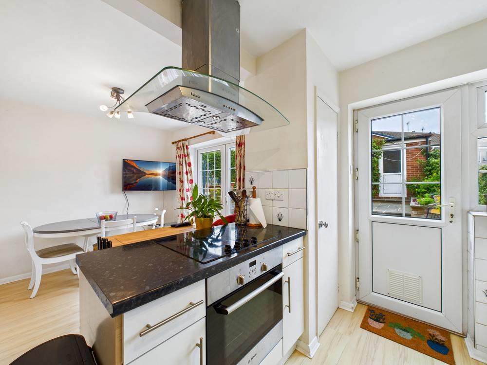With a range of wall and base unit units and the kitchen island effect which opens over into the dining area. The kitchen has UPVC double glazed rear window and door and the patio area has UPVC double glaze patio doors which lead to the garden. The kitchen has a space for a washing machine. There is an electric oven hob and extractor hood over and the stainless-steel sink with drainer and mixer tap. Gas central heated radiator and partly tiled walls.
